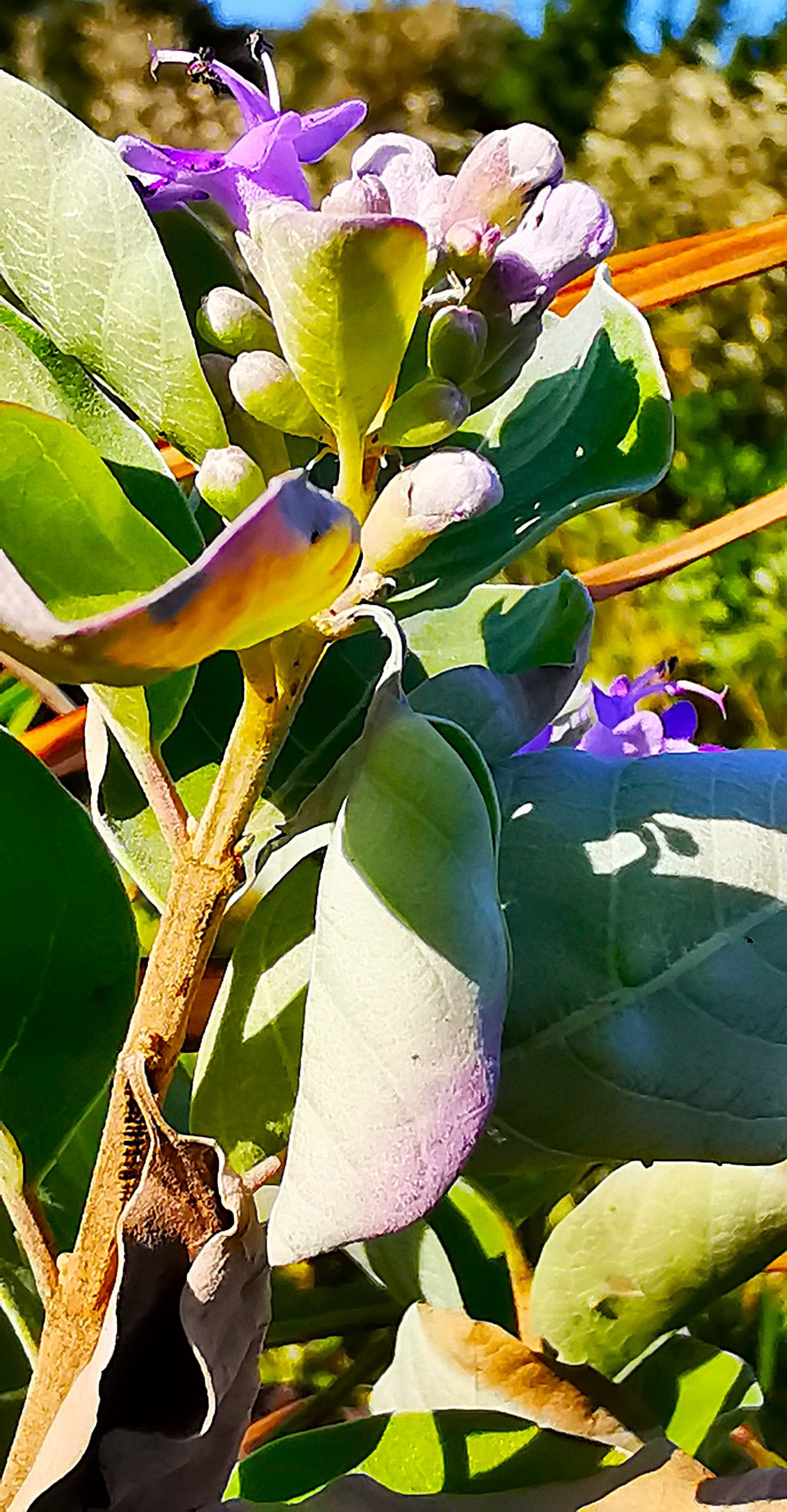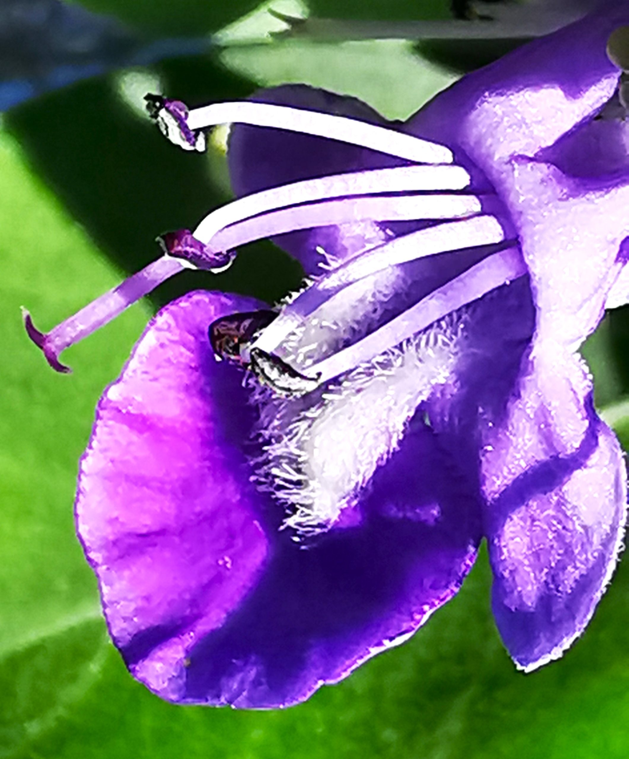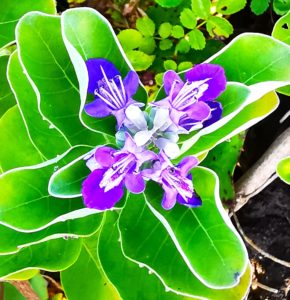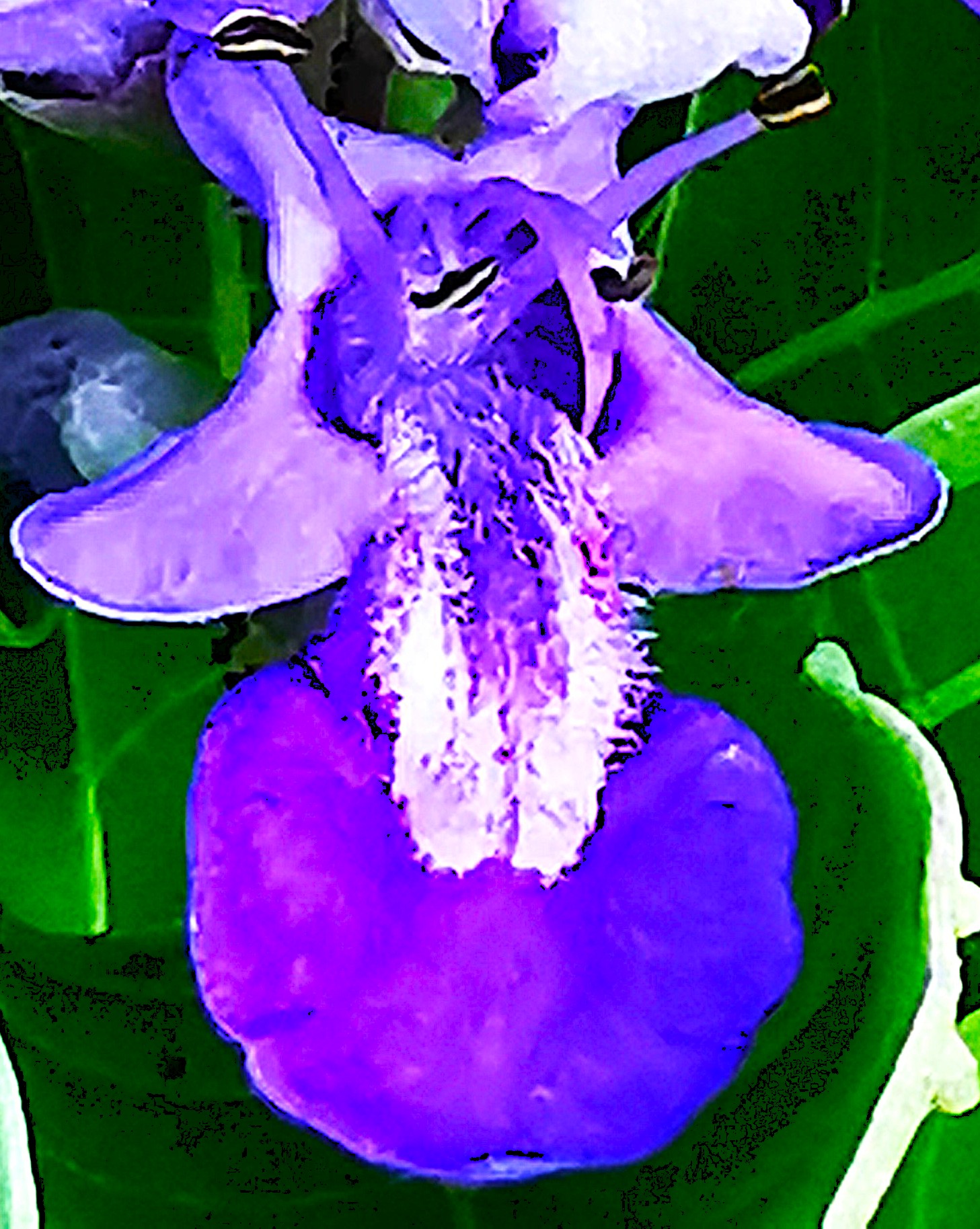 夏期のいがいが根を訪れと高貴な芳香が漂い、それに誘われて進むと紫色の花が辺り一面に浮かんでいる光景が目に入る。小さな花であるがじっくりと見ると潮が舞う過酷な岩場で生き抜くための知恵が見て取れる。先ずは花の構造を見てみよう。花冠は上下に分かれた口唇形で、上唇は2裂し、下唇は3裂するが蕊が花冠の外に飛び出し、その基部より真っ白い細かな腺毛が最下部唇まで密生し、その部分がまるで舌を出しているように見える。蕊が外に飛び出すのは花冠の中の付着した塩分と湿度で劣化を避けるためであり、真っ白な腺毛は乱反射で強烈な光を発して訪虫を呼び寄せるのである。また本種を真上から見るとまるでフラワーデザイナーの作品と紛おう程である。紫の花冠を白く縁どられた葉が揺り籠のように包み込み紫、赤紫、緑、白の見事な色彩美が浮き出て昆虫だけでなく私達人間をも魅了するだけでなく、葉裏の毛が岩からの輻射熱を遮る耐熱服であることを知れば単なる優美では収まらない植物でもある。こんな優美鉄壁な花だが「馬鹿の花」と呼ぼれているのをご存知であろうか。上記の「舌を出しているように見える」と書いたがよく見ると辺り一面、正に「あっかんべー」をしている様に見え、あたかも眺める人を馬鹿にしている花なのである。